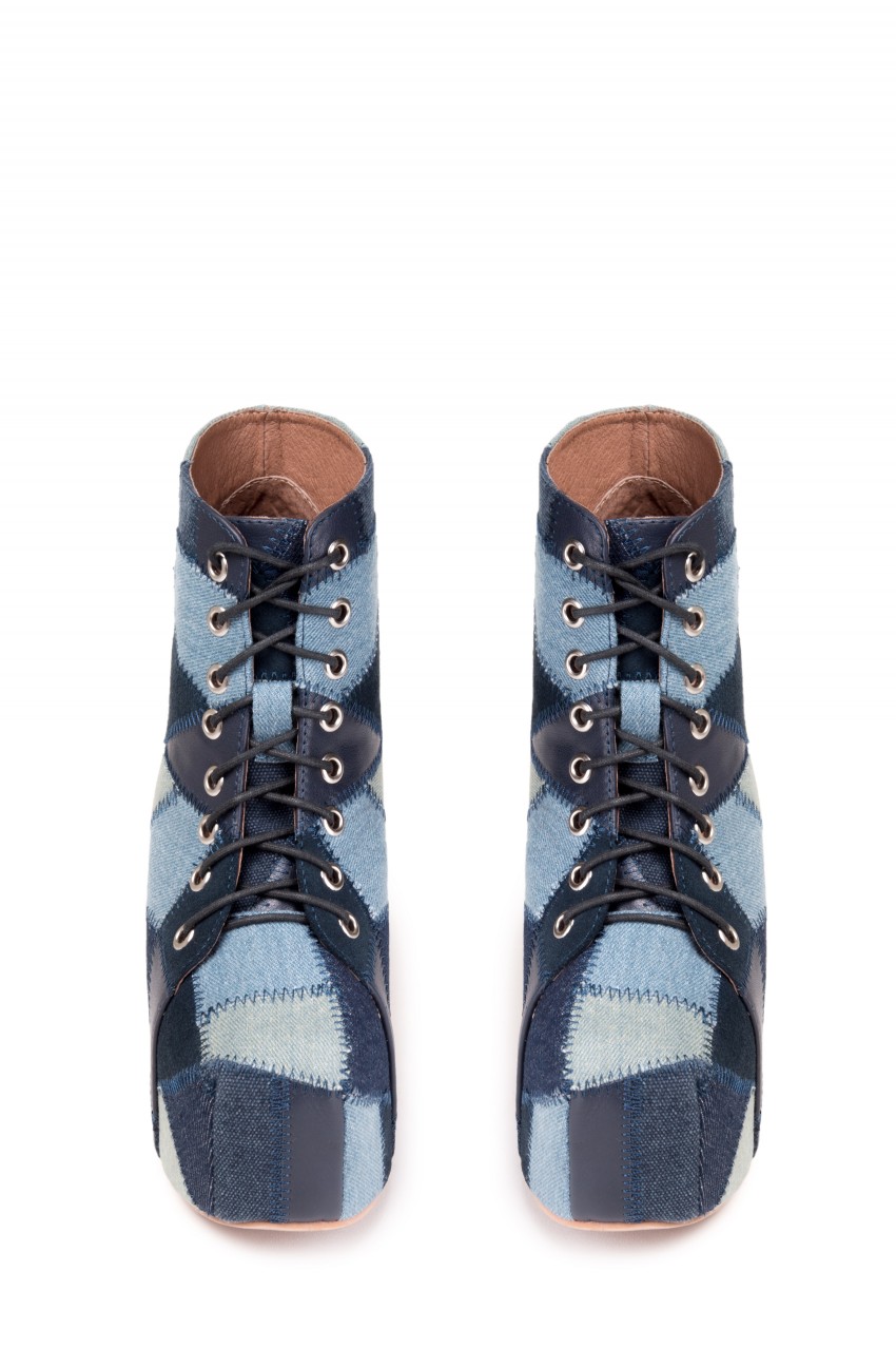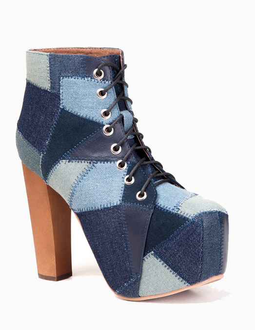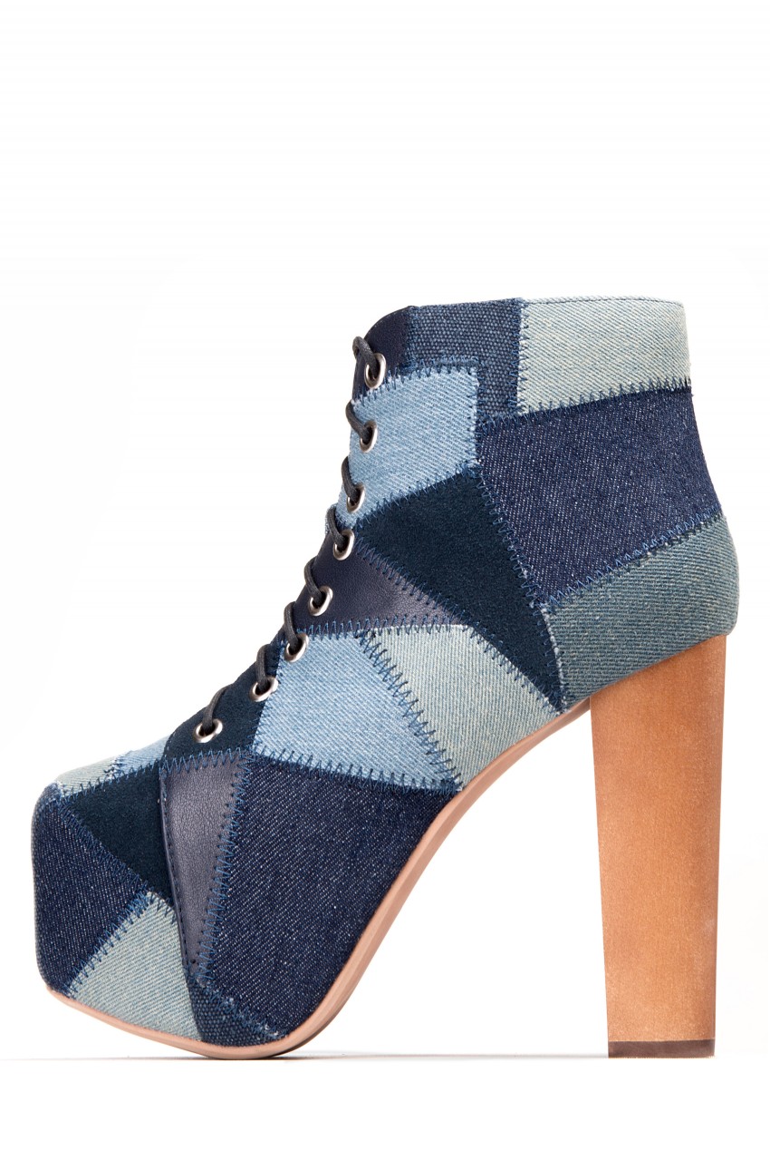• Denim and leather patchwork platform heeled.